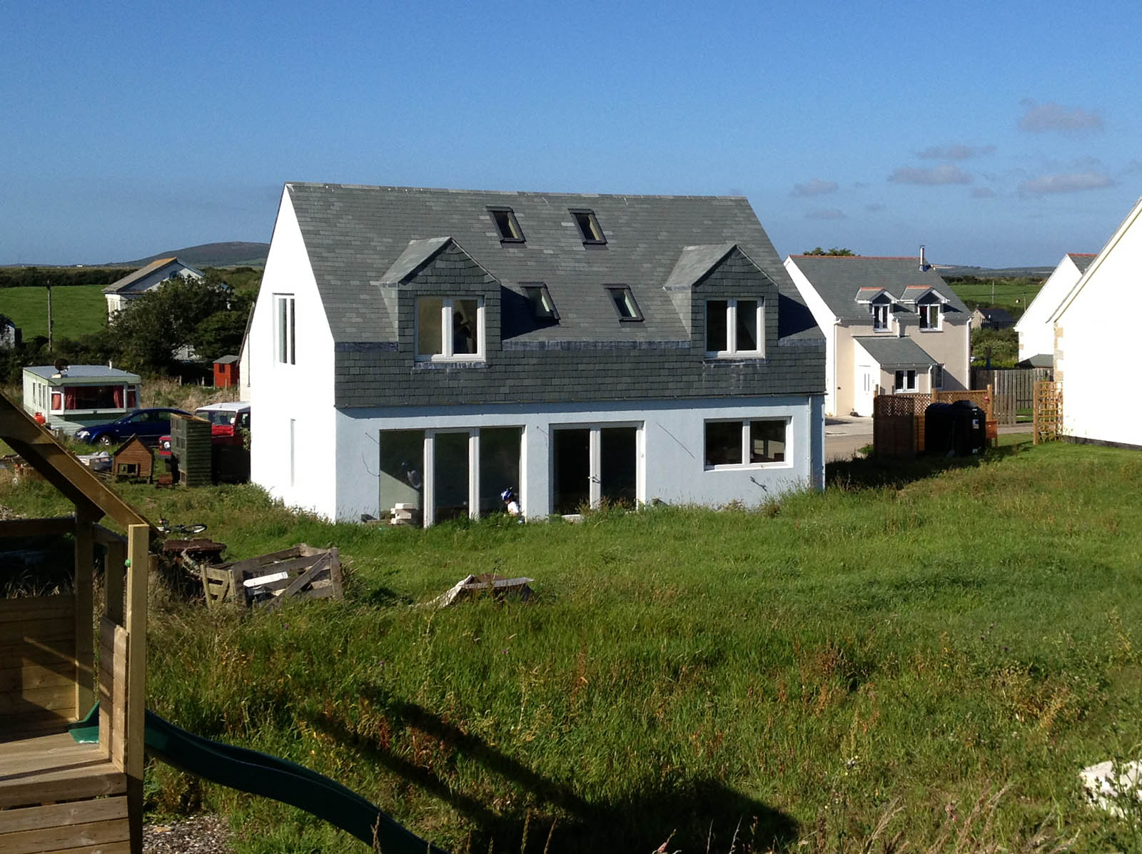 Despite the extra cost the local planning authority insisted on dormer windows to both front and rear. The timber frame was built off-site and erected by a local contractor. Most of the subsequent building was undertaken by our client including all the roofing.