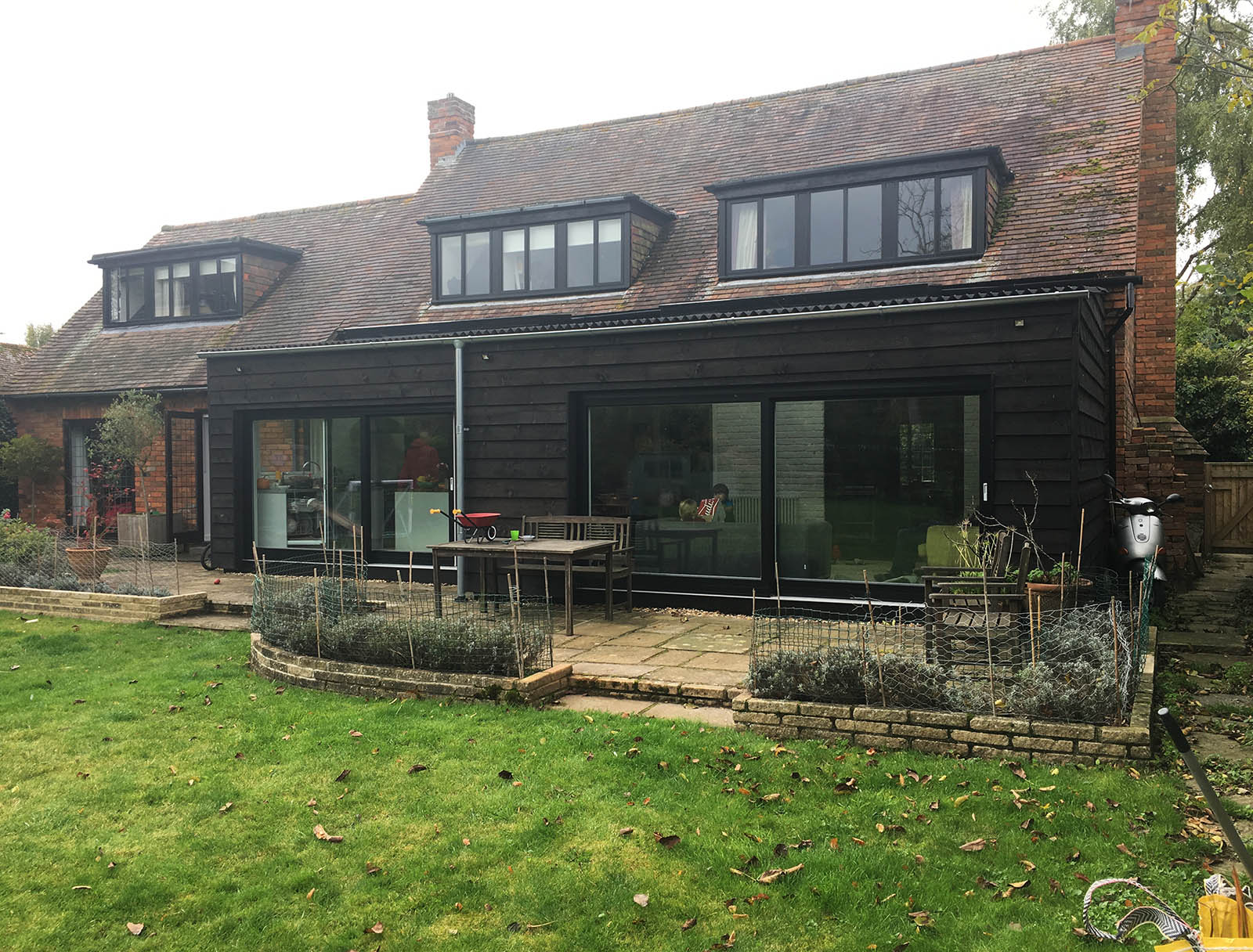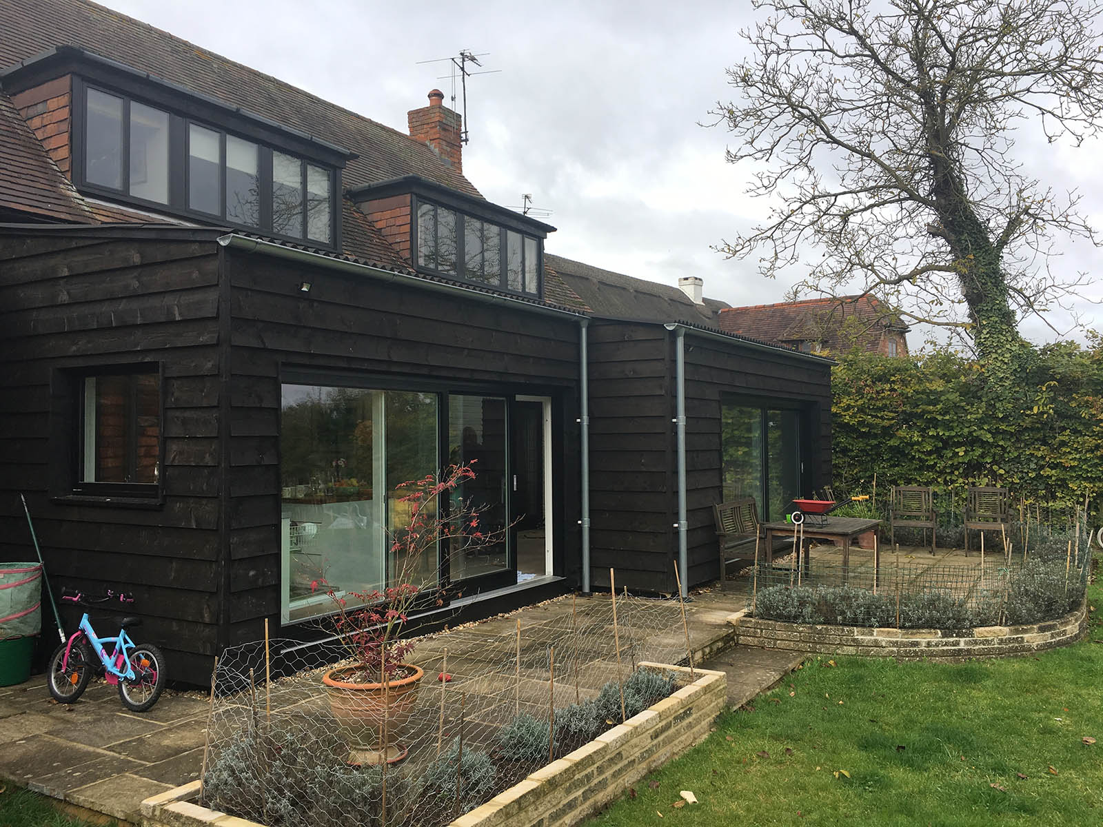This house had been built by a developer in the 1980s to look like a historic cottage. Our client was keen to extend the building in a sympathetic but contemporary way. Black timber and agricultural fibre cement roofing were used with large areas of glazing.