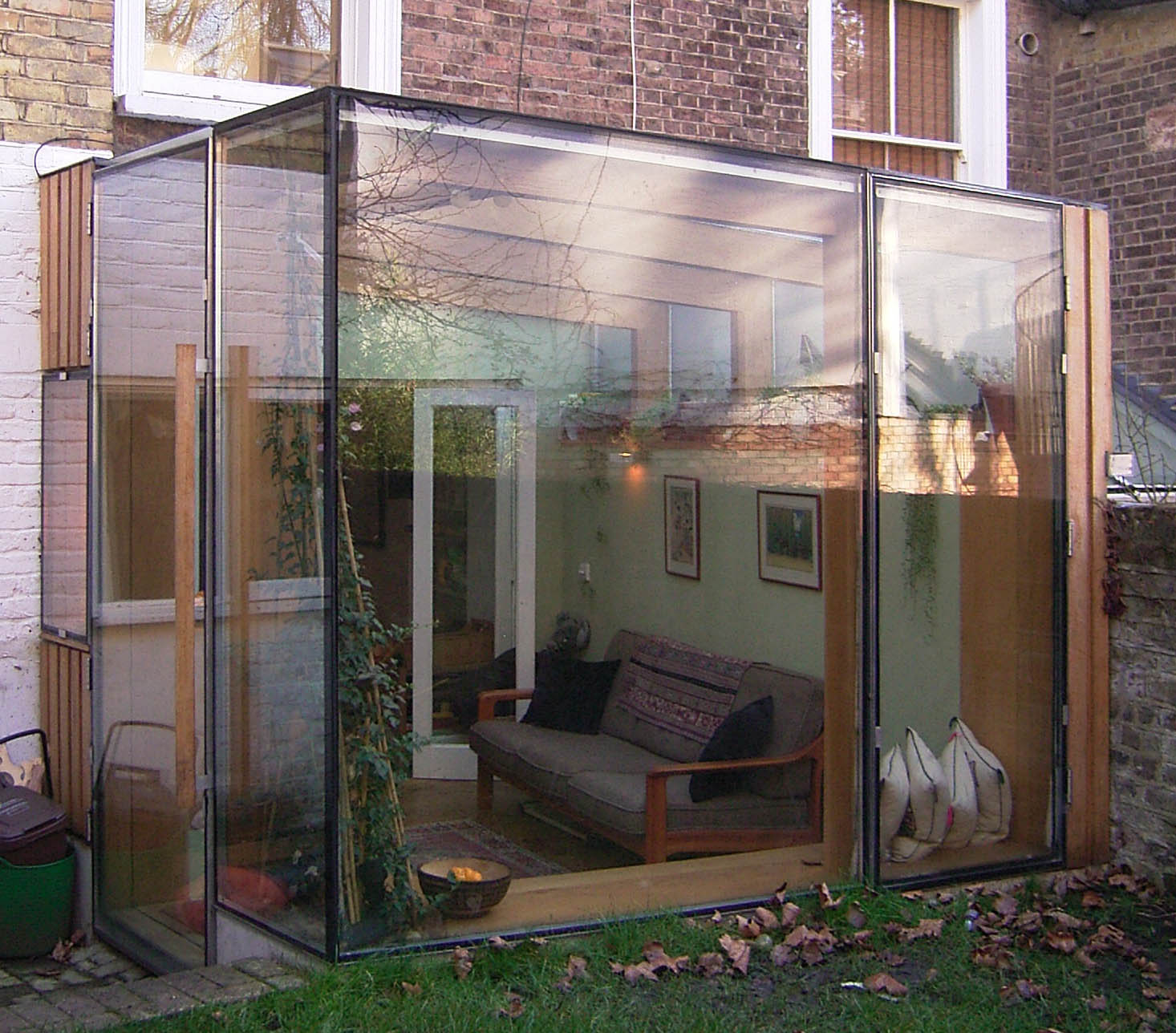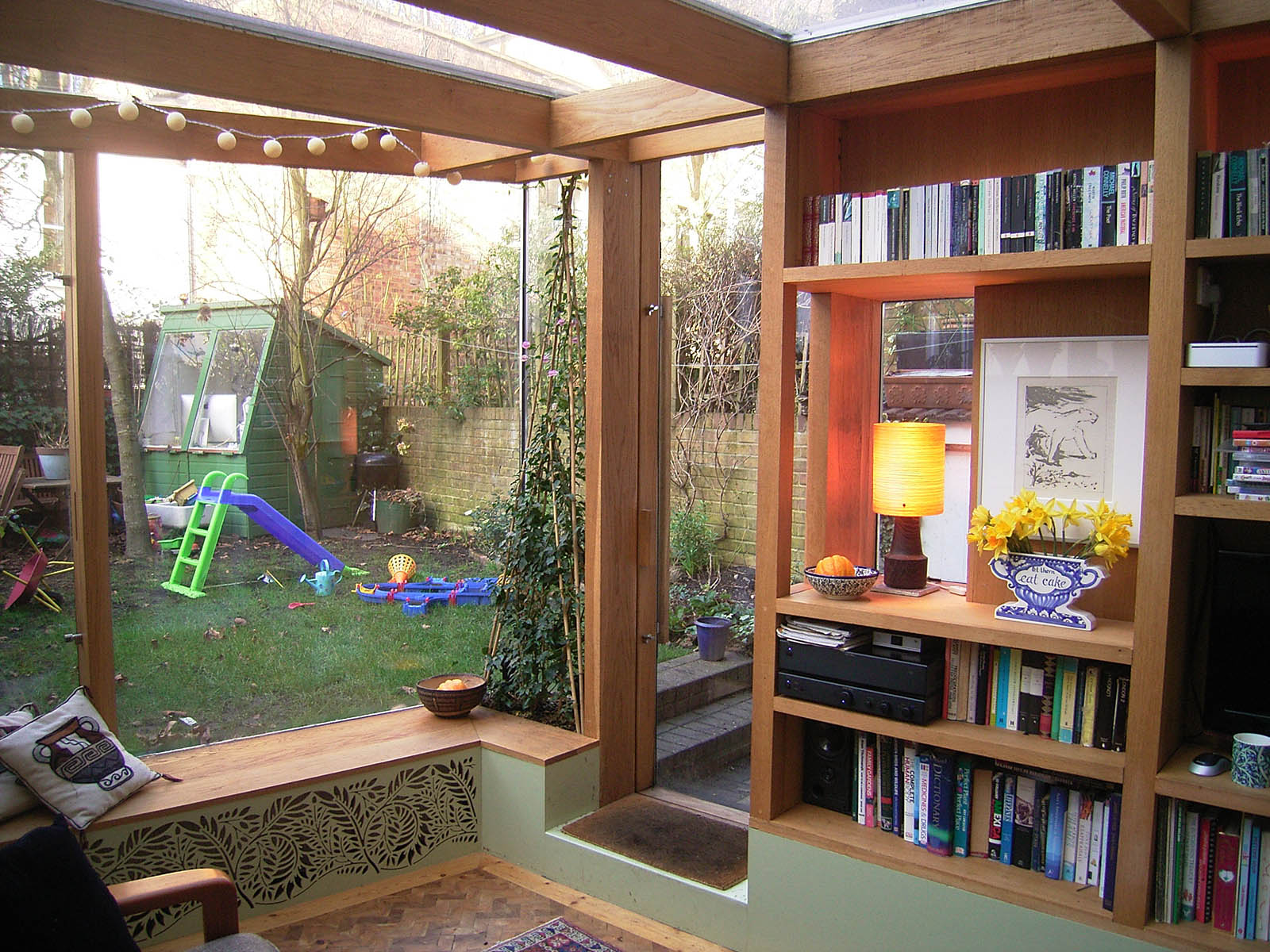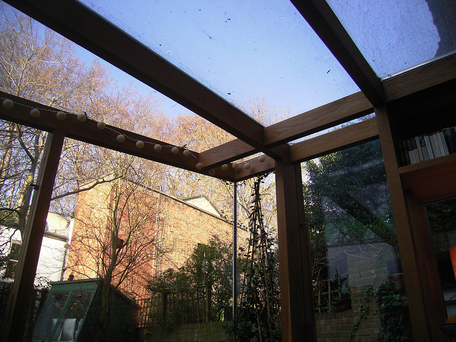 The site was completely enclosed requiring glass panels to be carried through the neighbours garden. The oak frame was partly fabricated in the workshop at the Bartlett school of Architecture.