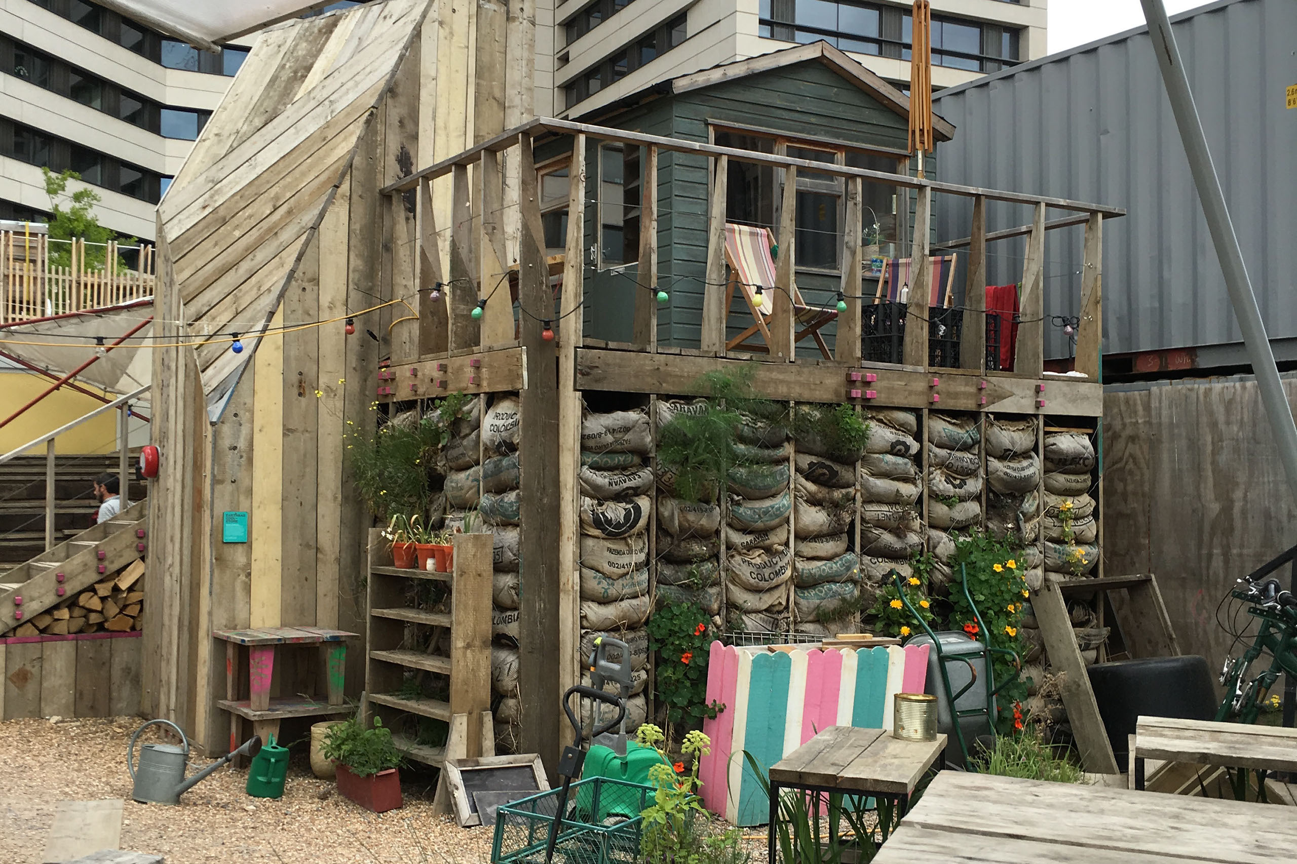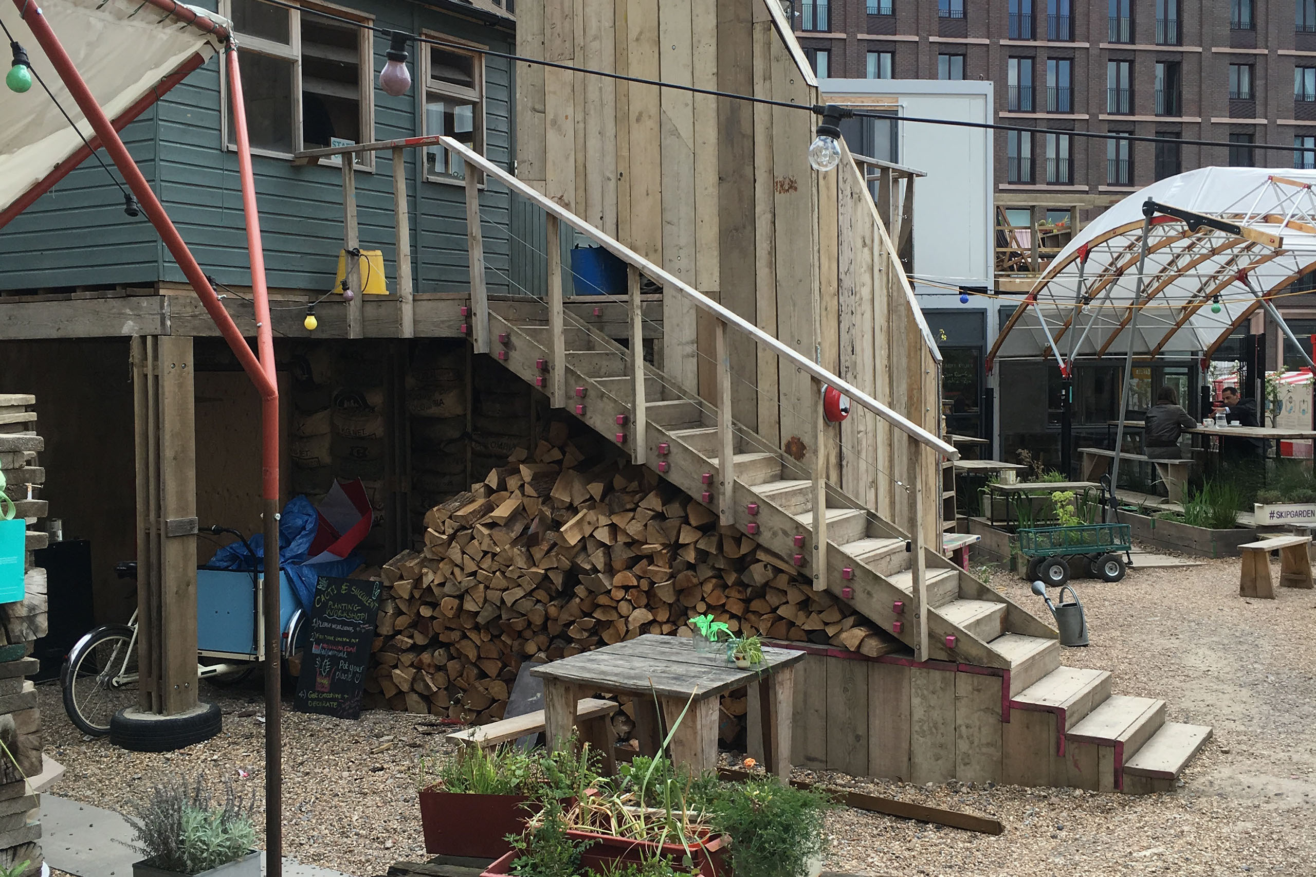 The King's Cross skip garden was developed by students from the Bartlett School of Architecture's undergraduate students in 2015 with tutors Jan Kattein, Julia King and David Eland. The client Global Generation provided support and encouragement. Structures were designed and built by the students with support from William Hodgson who helped to ensure they were built safely and the site was well managed. The timber structure shown was designed and built by Ali Conning-Rowland.