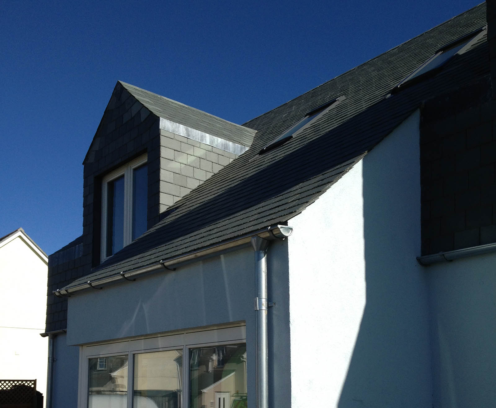 Despite the extra cost the local planning authority insisted on dormer windows to both front and rear. The timber frame was built off-site and erected by a local contractor. Most of the subsequent building was undertaken by our client including all the roofing.
