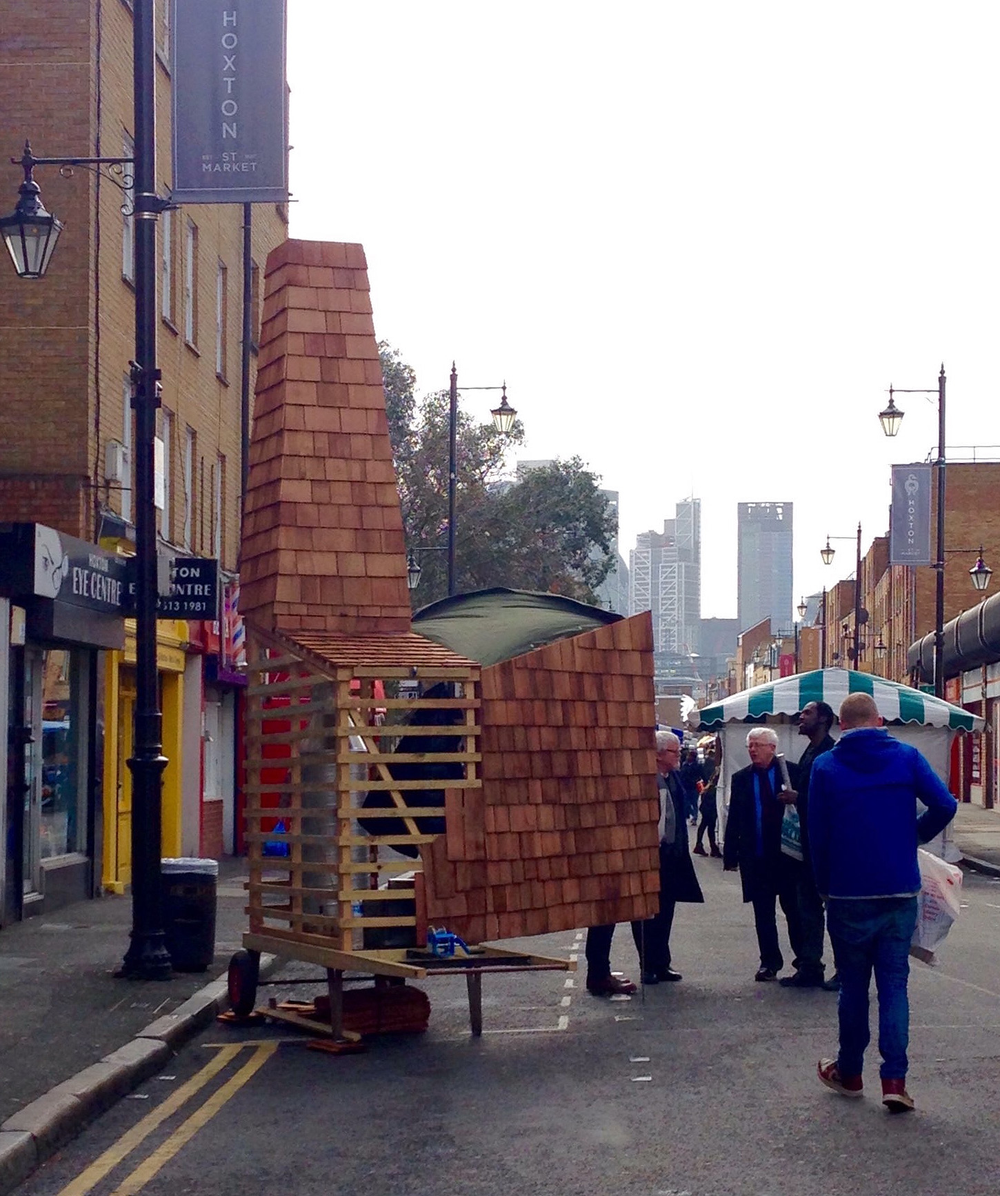 Visitors to the market stall, shown in Hoxton Street, were encouraged to test their skills adding shingles to the partly complete structure. It contained a brazier to keep warm which produced smoke from its chimney.