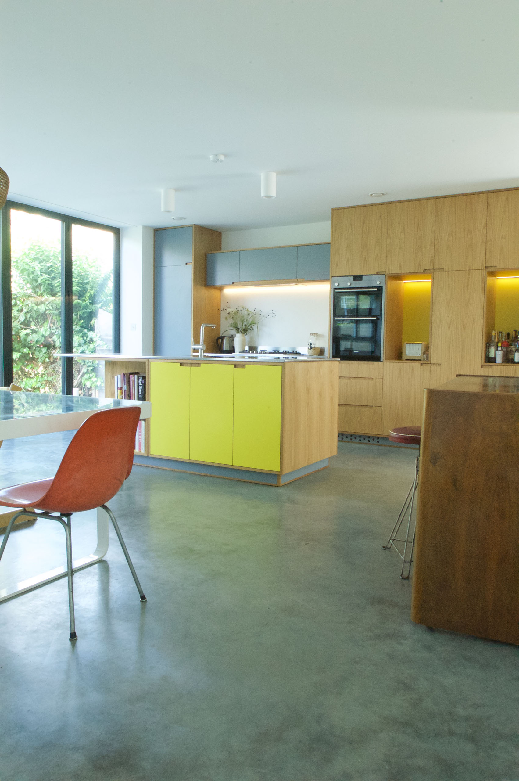 A large kitchen dinning room occupies most of the floor of the original dwelling. The wall to the garden is all glazed allowing for a feeling of spaciousness. The bespoke kitchen was designed by the client with a cabinet maker Bespoke Design and Build.