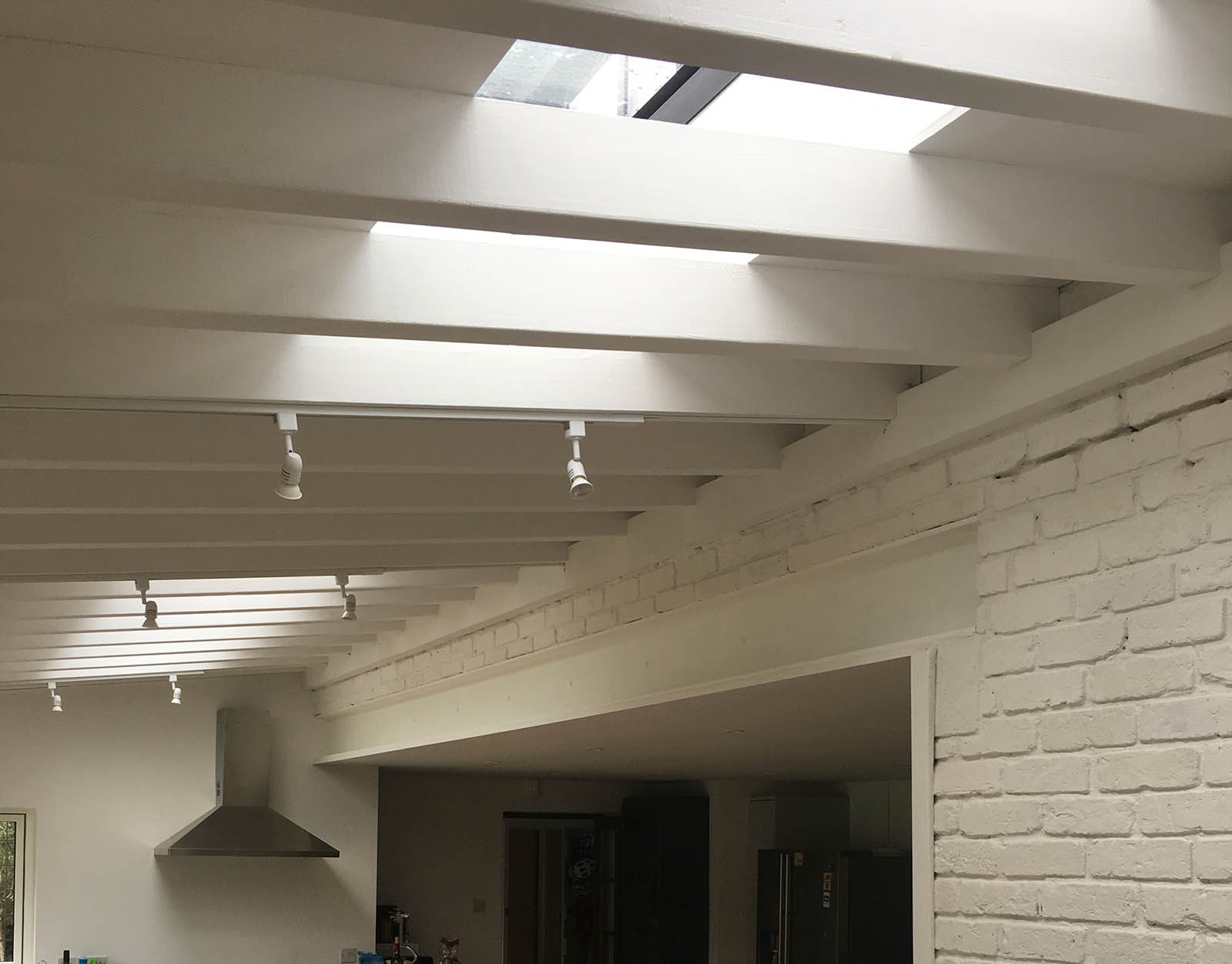 To keep the roof pitch low the beams crossed below the rooflights adding to the interest of the internal space.