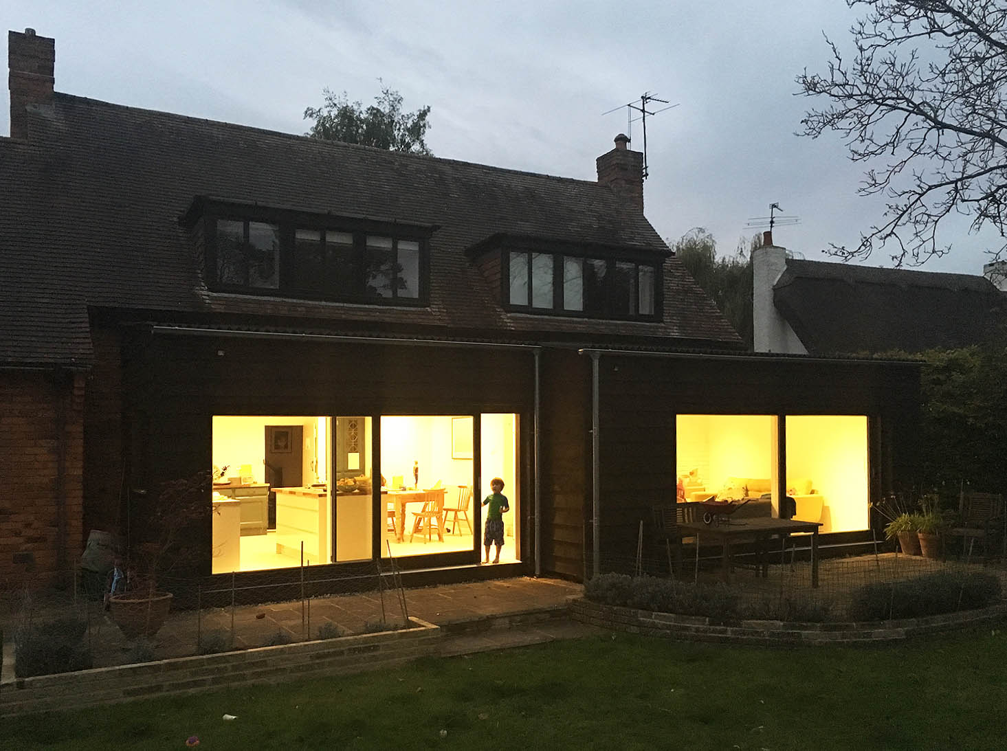 This house had been built by a developer in the 1980s to look like a historic cottage. Our client was keen to extend the building in a sympathetic but contemporary way. Black timber and agricultural fibre cement roofing were used with large areas of glazing.